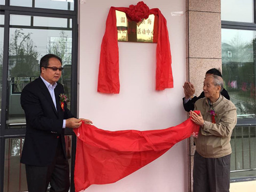 廖春荣先生(左)为岳松老年活动中心揭牌