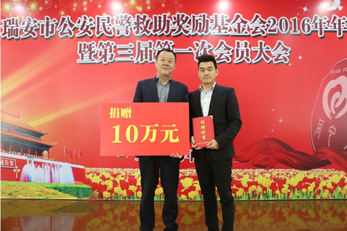 近日,瑞安市公安民警救助奖励基金会2016年会在市委党校召开,俄罗斯中国和平统一促进会、俄罗斯远东地区温州商会、巴西温州同乡联谊会等侨团代表参会,西班牙青年侨商杨志产、周美浩,捷克侨商程志骇、意大利侨商缪长寿等也出席了大会。他们分别以侨团或个人的方式向基金会捐赠了共计60余万元的善款,用于民警救助奖励,体现了瑞安侨界对公安民警的支持与关爱。