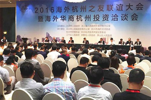最近,由浙江省外侨办、杭州市人民政府主办,杭州市侨办、杭州市侨商协会等承办的2016海外杭州之友联谊大会暨海外华商杭州投资洽谈会在杭州举行。杭州市侨商会名誉会长方杰、周王汉,会长姜际春,监事长陈伯滔,副会长洪云芬、丁德坤、戚文林等30多位侨商与来自80多个国家和地区的600余名海外华商、海外浙江籍侨团负责人、高新技术人才欢聚一堂,共叙爱国爱乡之情,并进行项目洽谈。