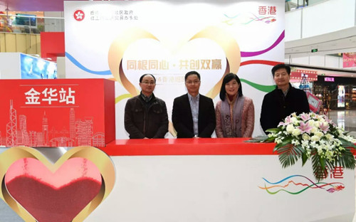 近日,在金华万达广场举行了 “同根同心•共创双赢” 2016香港巡展开幕典礼。香港特区政府驻沪办主任邓仲敏、金华市人民政府副市长邵国强、金华市人民政府港澳事务办公室主任章宏、金华市人民政府办公室副主任张群环出席了开幕式并一起为开幕式剪彩。