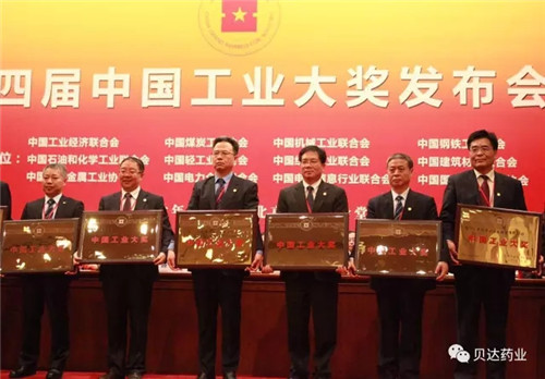12月11日,第四届中国工业大奖表彰大会在北京人民大会堂隆重举行。第十届全国人大常委会副委员长顾秀莲,中国工业经济联合会会长、工业和信息化部原部长李毅中等领导出席表彰大会,并为获奖代表颁奖。贝达药业自主研发的国家一类新药——盐酸埃克替尼(凯美纳)获得中国工业领域最高奖项“中国工业大奖”,省侨商会科技创新委员会主席、贝达药业董事长丁列明博士参加大会并领取了奖杯、奖牌。