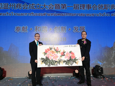 朱海宏向泰国温州商会会长祁晓云赠送《花开富贵图》