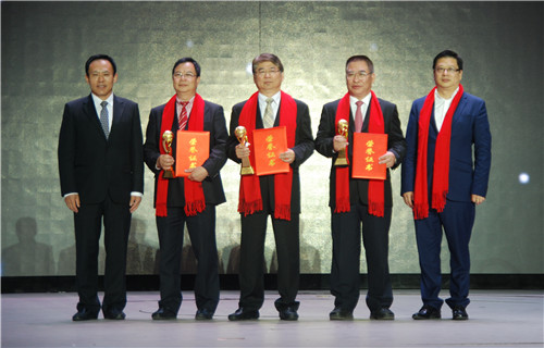 中国侨商会秘书长于晓(左一)、省侨商会常务副会长陈乃科(右一)为杰出成就奖获奖者颁奖