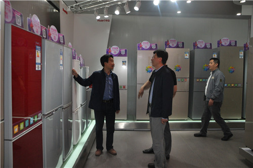 在产品陈列室,考察团一行察看了华日的大对开门冰箱,法式对开门冰箱,系列无霜冰箱,高端变频冰箱和互联网远程控制冰箱。高技术含量的华日冰箱新品给每一位参观的领导留下了深刻的印象。华日产品在专业制冷领域所取得的进步和荣誉,得到了领导们的肯定。