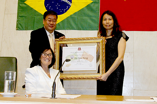 巴西圣保罗州议会于近日在议政大厅举行颁奖仪式,为增进中巴两国人民友谊、促进经贸交流作出贡献的杰出华人颁发了特别贡献奖,巴西金华同乡总会会长胡友能名列其中。这位已在巴西闯荡了15年的侨领,始终不忘家乡,为招商引资牵线搭桥,为困难儿童捐资助学,他希望能带动更多在巴西的家乡人努力奋斗,助力家乡发展。