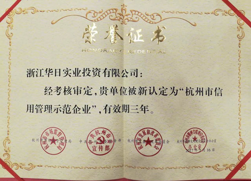 近日,杭州公布了2016年度“杭州市信用管理示范企业”名单,浙江华日实业投资有限公司也名列在榜。