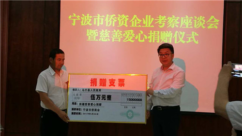 在乌什县政府,考察团与乌什县领导及有关部门进行座谈,就乌什县投资环境、自然资源、矿产资源、人文资源等进行交流了解。会上,还举行了宁波市侨资企业西部行慈善爱心捐赠仪式,向乌什县捐赠慈善爱心捐款5万元,用于捐助乌什县20名(侨眷)家庭学生和10名贫困侨眷,捐赠款来自宁波市侨商会“侨爱基金”。