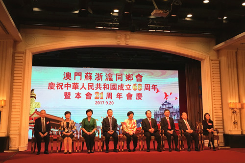 9月20日,澳门苏浙沪同乡会在澳门举行庆祝中华人民共和国成立6 8周年暨该会21周年会庆,中央政府驻澳门联络办公室副主任姚坚,外交部驻澳门特别行政区副特派员潘云东,澳门立法委主席贺一诚,浙江省委统战部常务副部长金长征,浙江省政府港澳办副主任陈江风等到会致贺,并与旅澳乡亲共聚联欢,畅谈发展。