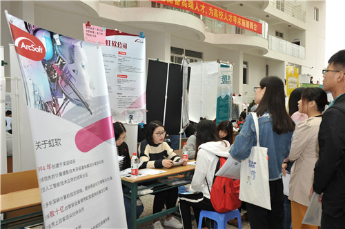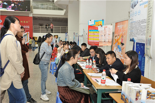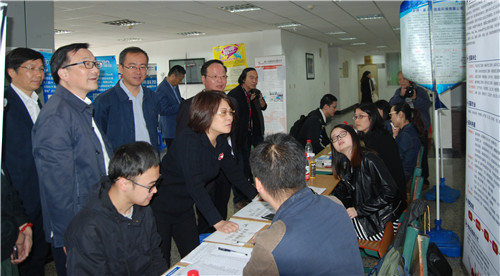 吴晶主席(前左二)、岑国荣书记(左一)、张维仁副主席( 左二 )、朱泽飞校长(左三)、吕金海副校长(后左一 )等在招聘会现场