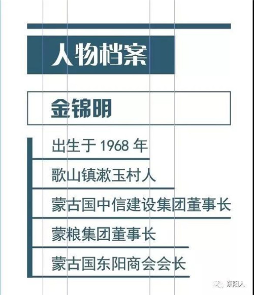 商海沉浮,大浪淘沙。来自歌山镇淑玉村的金锦明做过小生意,办过服装厂,后来到蒙古开发做房地产,闯荡经历跌宕起伏。在他多年打拼中,成立了蒙古国中信建设集团,组建了蒙粮集团,并当选为蒙古国东阳人联谊会(商会)首届会长、东阳市第十四届政协委员。