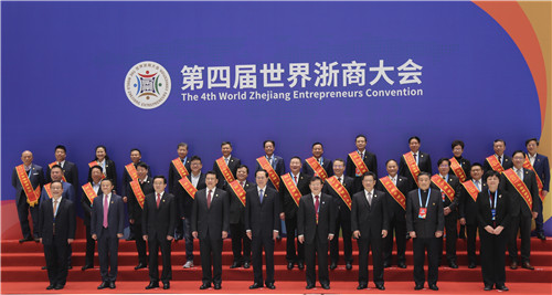领导与第四届世界浙商大会获奖企业家合影,二排右三为丁列明博士