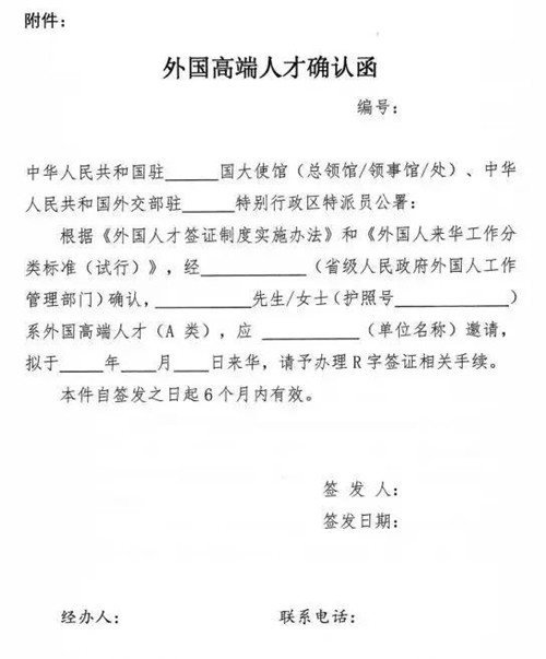 凭此函可获发R签证:5至10年有效、多次入境、每次停留180天,其配偶及未成年子女也将获发相应种类的签证。