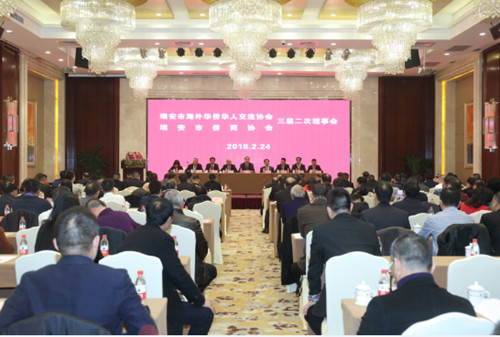 2月24日,瑞安市海外华侨华人交流协会暨市侨商会三届二次理事会隆重召开。省侨联副主席、瑞安市侨商会会长、市交流协会执行会长虞安林,省侨联副主席、瑞安市侨商会名誉会长刘光华,瑞安市侨商会监事长、市交流协会执行会长董邦云,市交流协会暨市侨商会执行会长王云桧、蔡新土、朱良仕及100余位市交流协会暨市侨商会会员参会。瑞安市委统战部副部长、市外侨办主任周靖出席。会议由瑞安市外侨办副主任、市侨商会执行会长潘李淡主持。