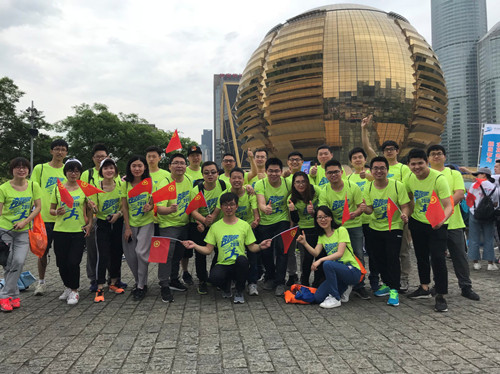 早上9点,出发的口令一发出,在省体育局副局长、奥运冠军吕林的带领下,大家从钱江新城城市阳台出发,沿着江堤列队前行。十公里的路途,聚光的每一位参与者都走的格外有劲,大家有说有笑,丝毫未感受到路途的疲惫。身穿统一的服装,展示着公司独特的青春风采。