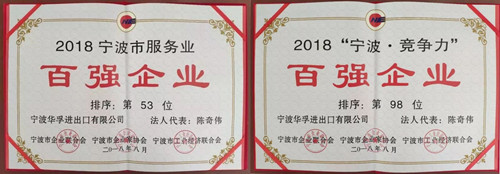其中宁波市侨商会常务副会长单位宁波华孚进出口有限公司以109522万元营业收入在宁波“百强榜”两大榜单中站稳了脚跟,荣获2018年“宁波·竞争力”百强企业第98位及宁波市“服务业”百强企业第53位。