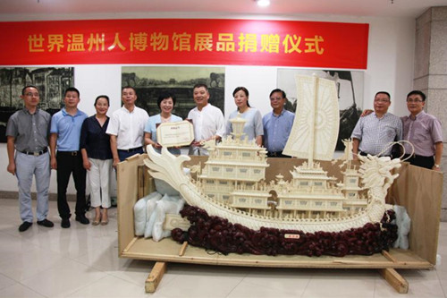 9月3日,洽逢世界温州人博物馆即将迎来开馆之际,为纪念“一带一路”倡议提出五周年,嘉兴侨商会常务副会长、葡萄牙华人企业联合会会长、平湖进口商品城董事长、温州籍企业家陈坚将私人收藏的1998年里斯本世界博览会中国馆镇馆之宝郑和下西洋骨雕珍品捐赠给世界温州人博物馆。