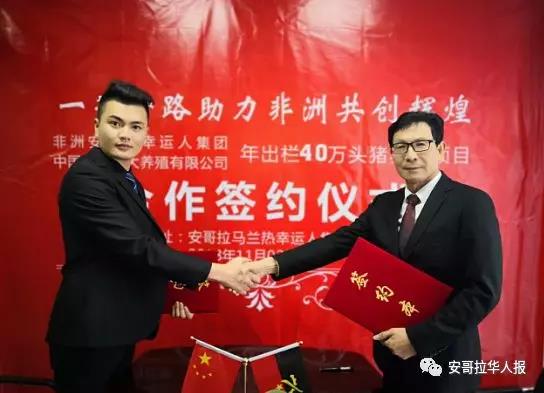 安哥拉幸运人集团董事长黄云丰(左)、安徽省宏大养殖有限公司总经理葛至兵(右)签约
