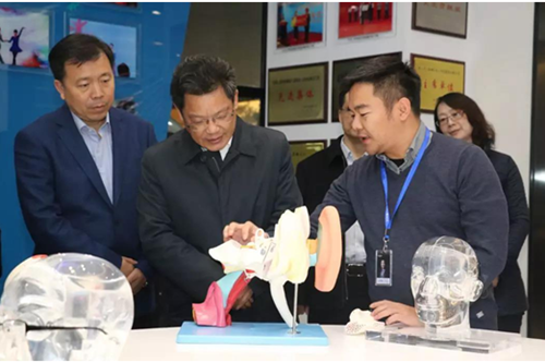 诺尔康总经理李楚(左三)向任振鹤书记(左二)等讲解人工耳蜗原理