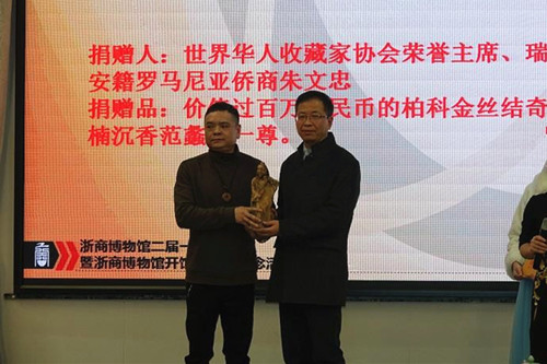 近日,浙商博物馆二届一次理事会暨开馆五周年纪念活动在杭州举行,瑞安籍侨商、柏科沉香收藏家朱文忠向浙商博物馆捐赠了价值百万元的柏科金丝结奇楠沉香范蠡像一尊。