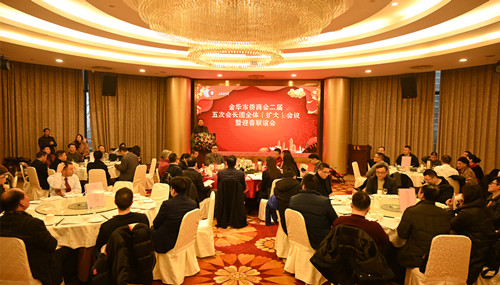 1月16日,金华市侨商会二届五次会长团全体(扩大)会议暨迎春联谊会在浙江师范大学国际交流中心召开。金华市外事办公室主任钟世杰、副主任金烨到会祝贺。市侨商会会长吴超英和会长团成员,顾问,维权委员会、智造委员会、青年委员会成员,部分理事代表及县(市、区)侨办负责人共90多人参加会议。市侨商会秘书长成盖平主持会议。