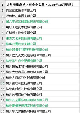 杭州市金融办相关负责人表示,这份名录的遴选标准是:符合产业发展导向、企业治理结构规范,以及具有较强产业技术优势或较大发展潜力的优质民营或国有企业。杭州市推动企业利用资本市场加快发展工作领导小组办公室会组织市相关职能部门和单位,对经认定的重点拟上市企业在上市过程中特定性需求及时响应,并结合职责合力提供常态化的长效服务。