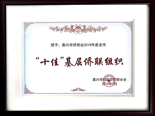 嘉兴市侨商会荣获2018年度全市“十佳”基层侨联组织称号;市侨商会副会长、歌斐颂巧克力小镇集团有限公司总经理莫雪峰,市侨商会理事、浙江上扬商业设备科技股份有限公司总经理杨人佩,市侨商会会员、威尔克工业纺织(嘉兴)有限公司总经理何建良荣获2018年度全市“十佳”侨界“双创”人才称号。