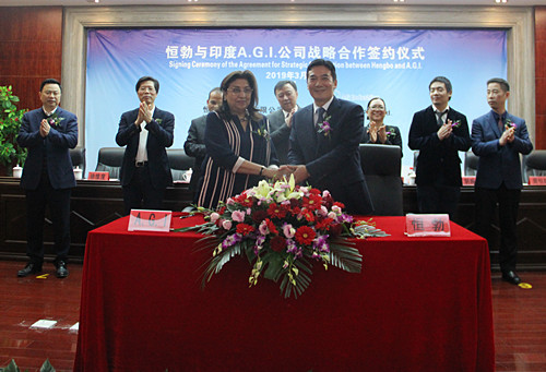 近日,侨企恒勃控股股份有限公司与印度A.G.I.公司战略合作协议签约仪式在台州举行,恒勃公司董事长周书忠与A.G.I.公司主席MS.GEETA ANAND分别代表双方签署战略合作协议,标志着双方全方位合作正式开启。