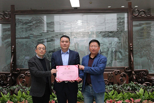 胡斌(左一)、张树荣(右一)为李选(中)颁证
