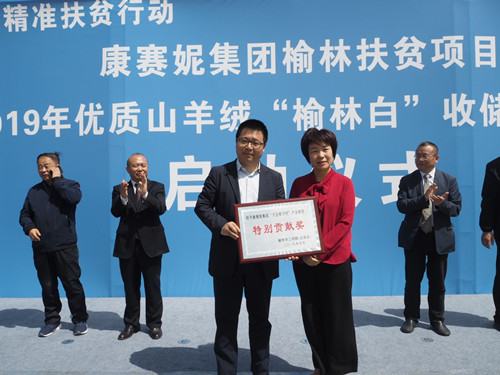 为表彰和鼓励康赛妮企业对榆林发展的支持和善举,榆林市政协副主席、工商联主席贾正兰代表榆林市工商联向康赛妮集团颁发“万企帮万村”产业扶贫特别贡献奖。
