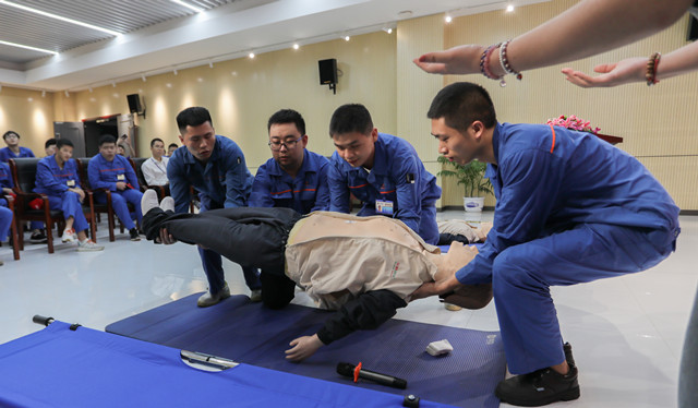“面对猝死患者,最有效的措施就是及时高效地进行心肺复苏。1分钟内开始的心肺复苏,患者生存率可高达90%,以后每延迟1分钟,患者死亡率将增加10%,超过10分钟复苏成功率几乎为零。”专业医师认真地讲解了急救的重要性,并强调了应急急救的操作要点和注意事项,随后手把手教授员工们做徒手心肺复苏术。